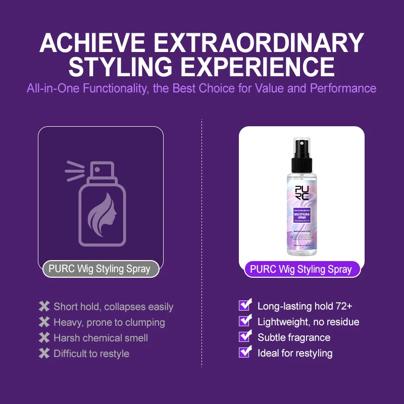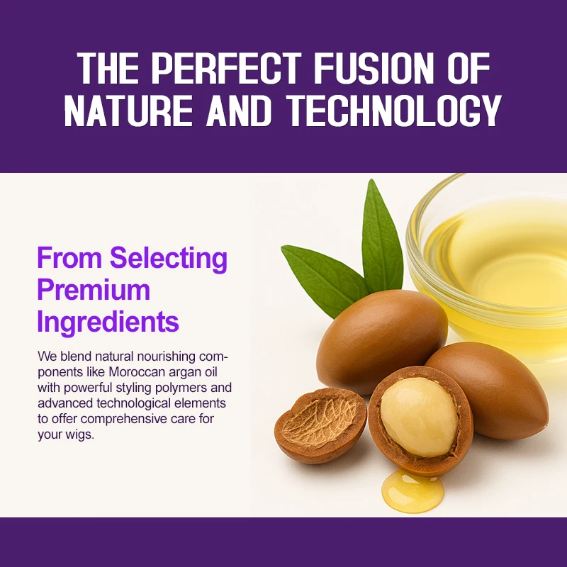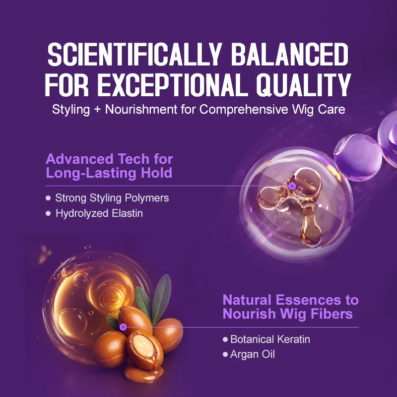 Using strong styling polymers, argan oil and other ingredients, 10-in-1 effect combines styling and care, 450° heat protection to reduce damage from styling tools, 72-hour long-lasting styling, easily solving the pain points of wigs being difficult to shape and easy to damage.