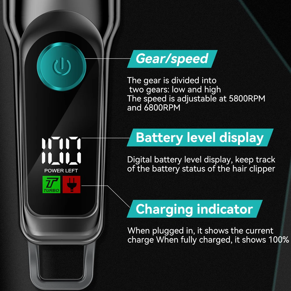[Powerful motor & Turbo Function]: This hair clipper is equipped with a powerful motor and has two optional speeds of 5800RPM and 6800RPM, which can easily trim hair and give you a smooth haircut experience.