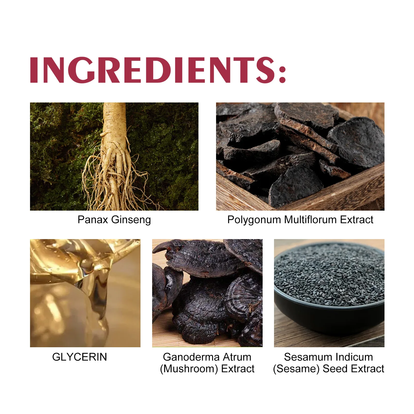 1.Our product is rich in Reynoutria multiflora extract. The plant pigments in it can dye white hair black without causing any harm to the hair. While dyeing hair, it covers white hair while also nourishing and caring for our scalp and hair.