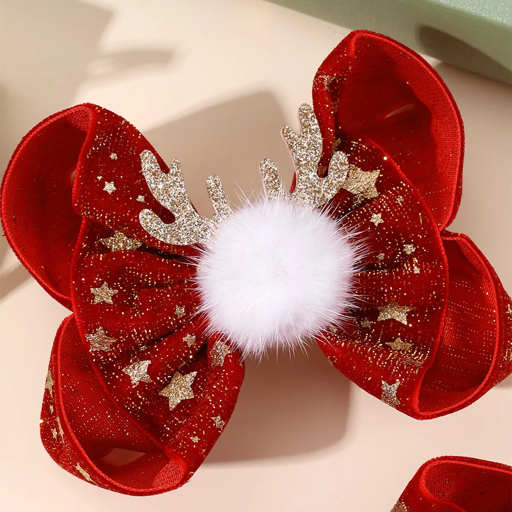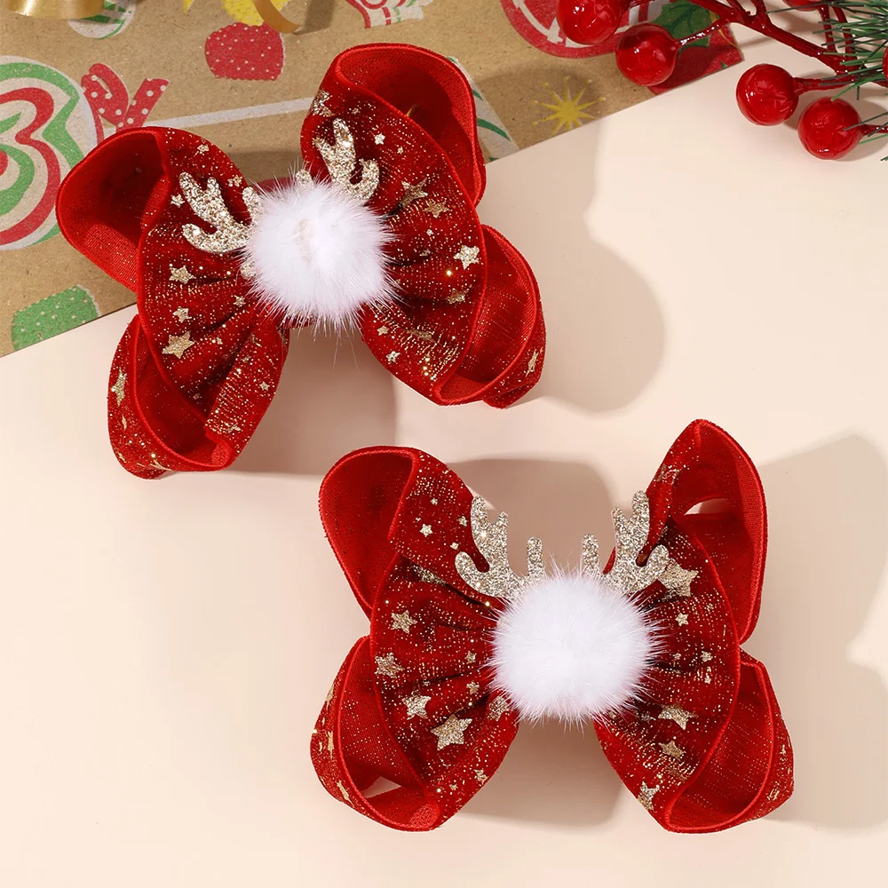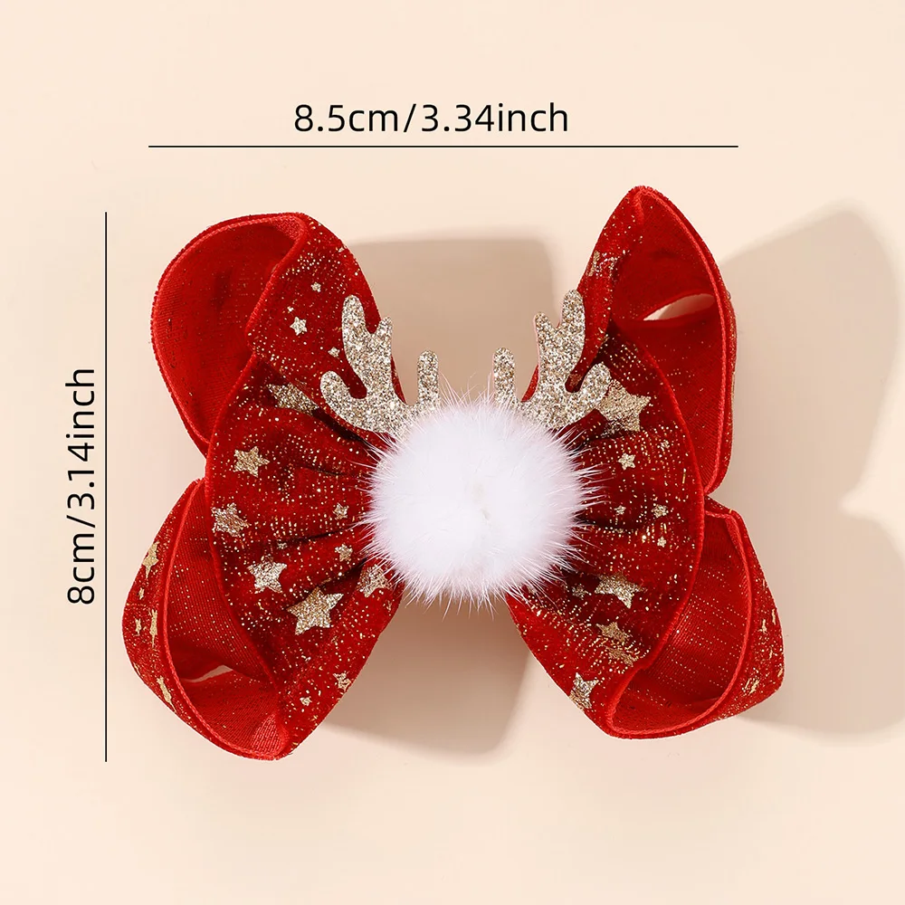 2Pcs Christmas Star Bow Hair Clips Glitter Antler Bownot Hairpins Vintage Velvet Barrette For Girls Xmas Headwear Accessories
