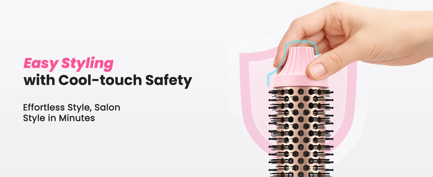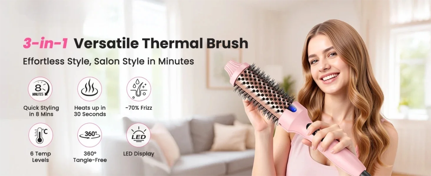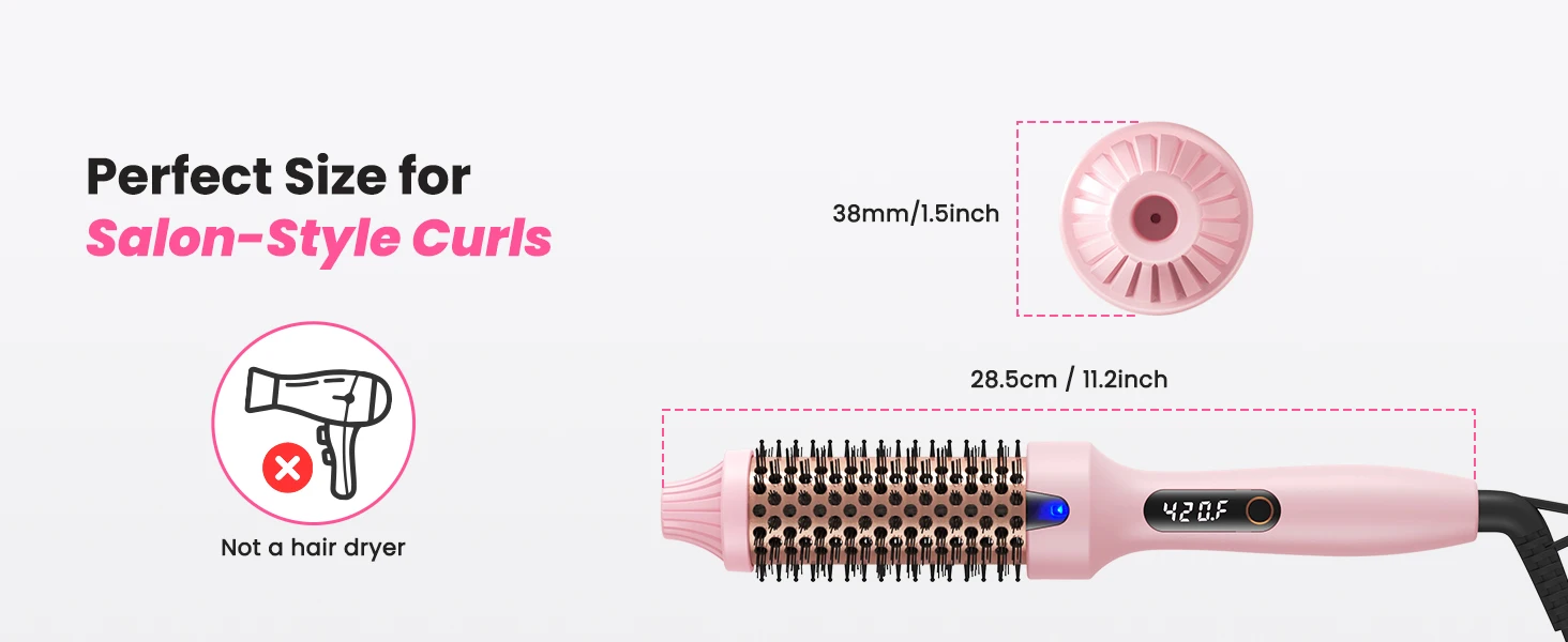 The heated thermal round brush with dual PTC heating warms up in 30 seconds. It works as a straightener, curling iron, and volumizing brush all in one. Easily smooth, curl, add volume, or detangle. Just wrap your hair around the barrel and slide down—get sleek, bouncy curls in minutes. No extra tools such as combs or clips needed. Save time and effort. Handles all your styling needs for any occasion