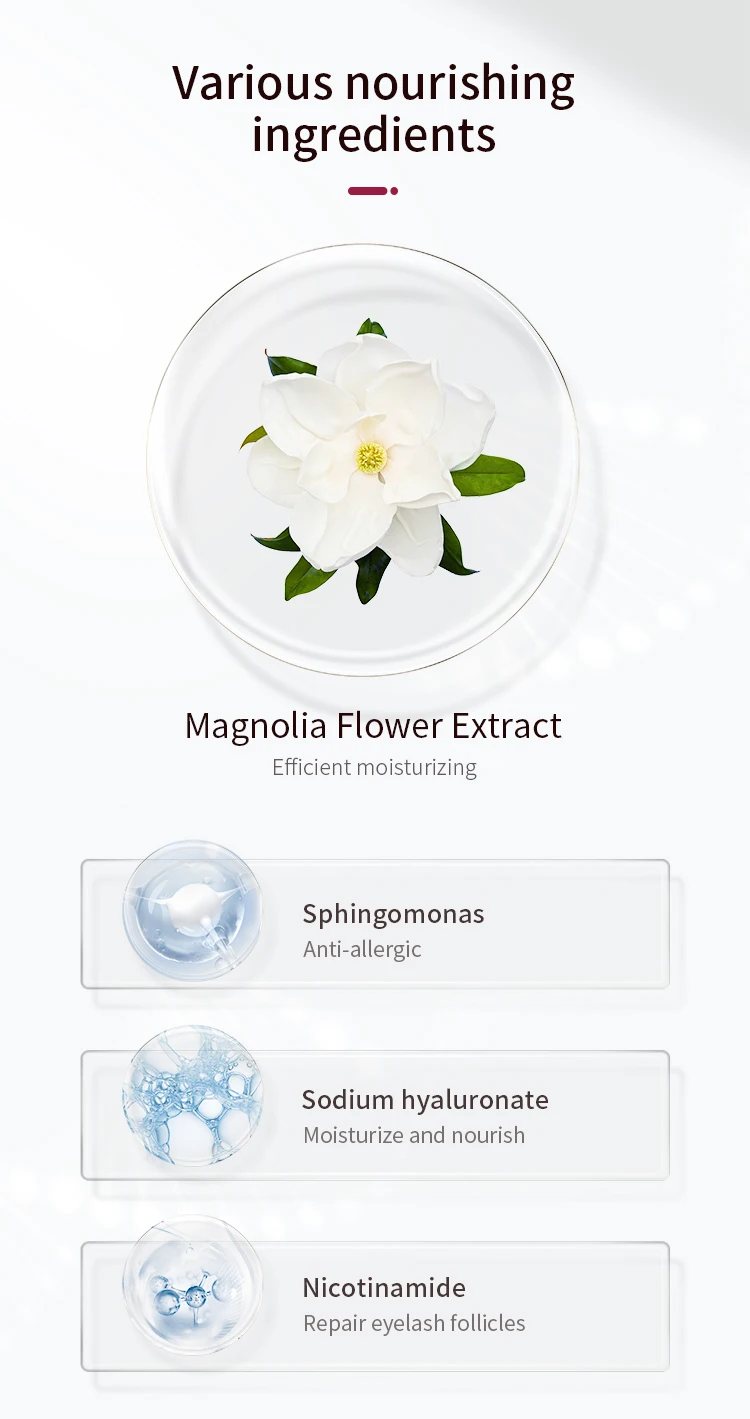 Sphingomonas :Anti-allergic; Sodium hyaluronate :Moisturize and nourish; Magnolia Flower Extract: Efficient moisturizing; Nicotinamide: Repair eyelash follicles