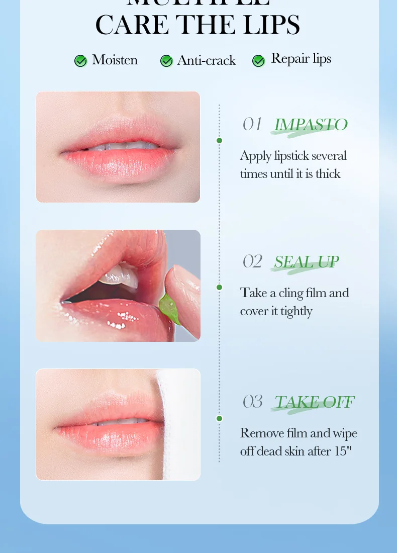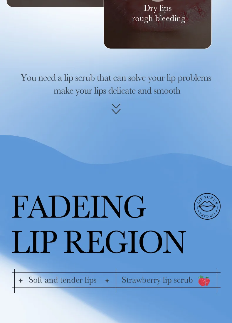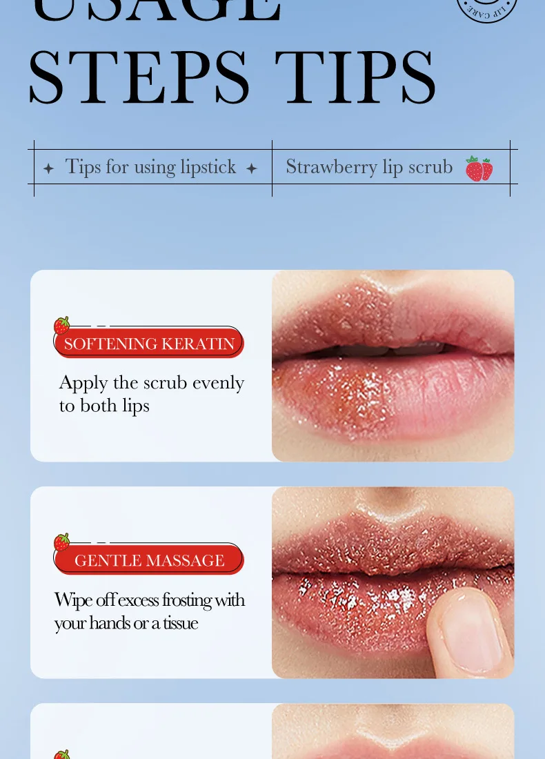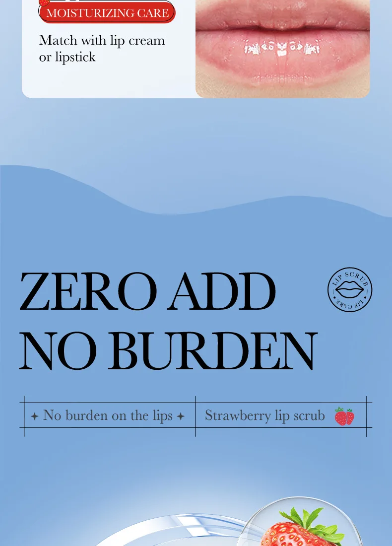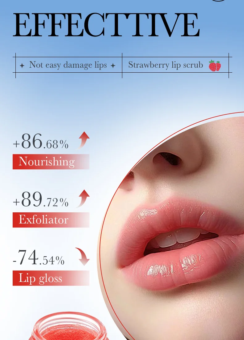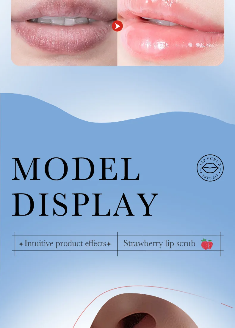 Fine scrub particles, gentle cleaning of the lipskin waste horny layer,moisturize and softlips, lighten lip lines,brighten lip color, so thatthe lips pink, delicate and smooth.