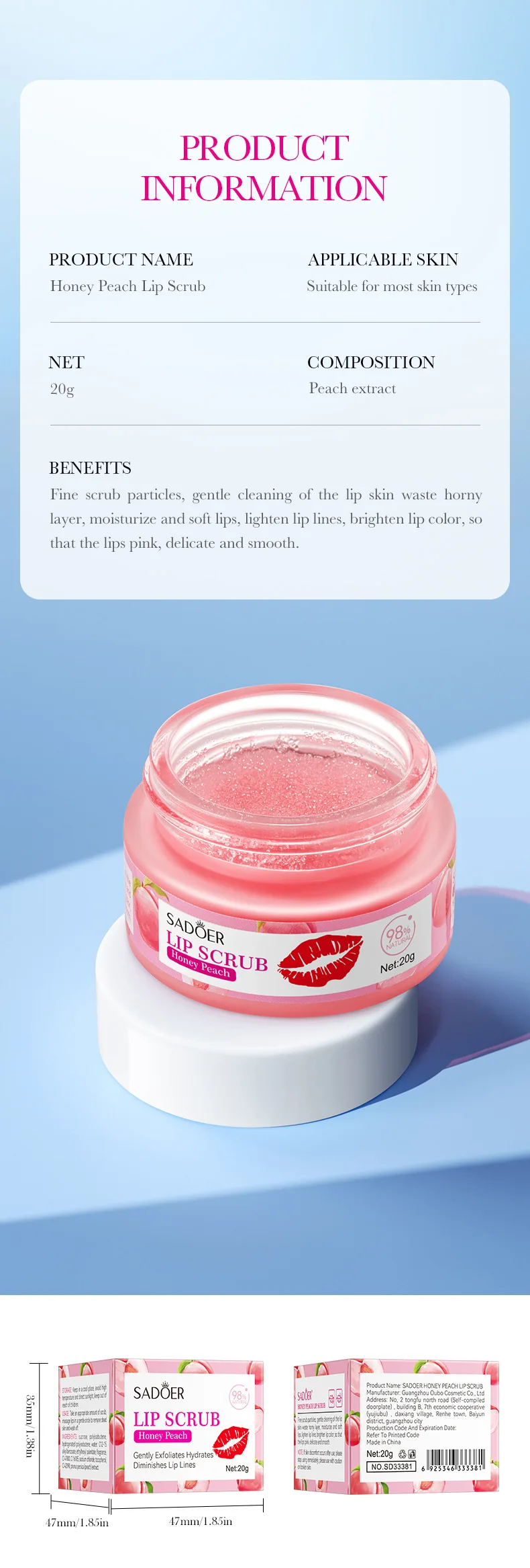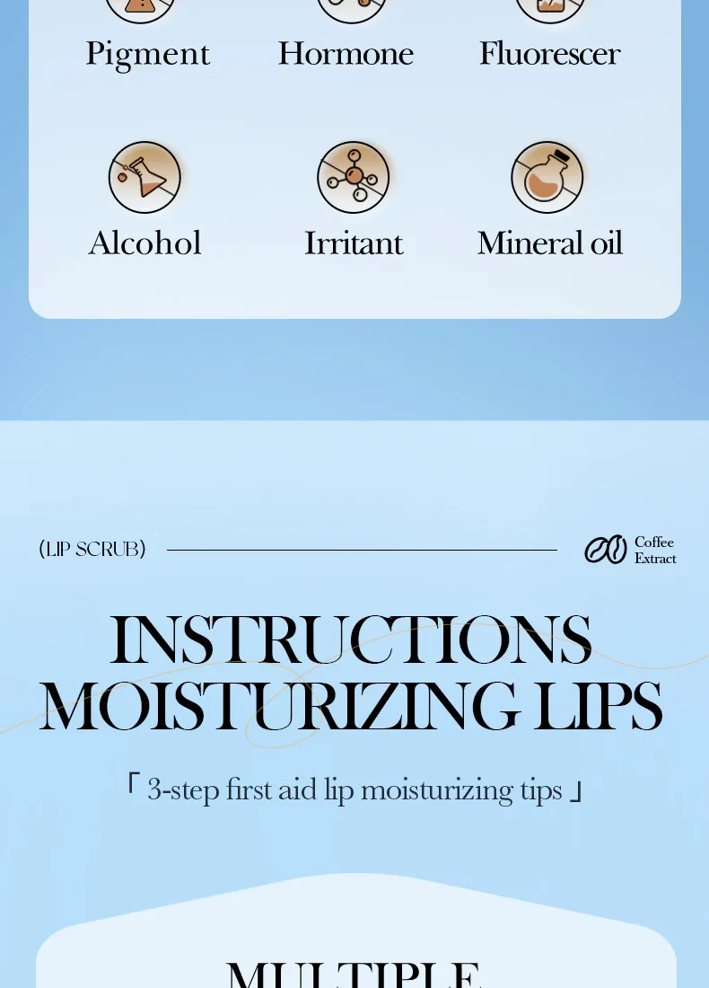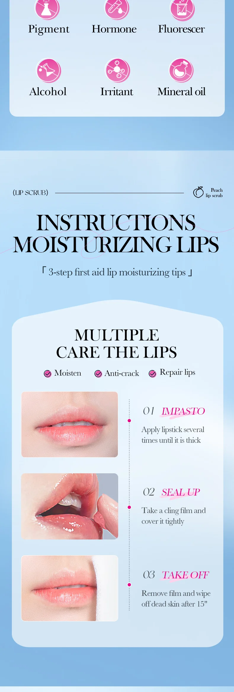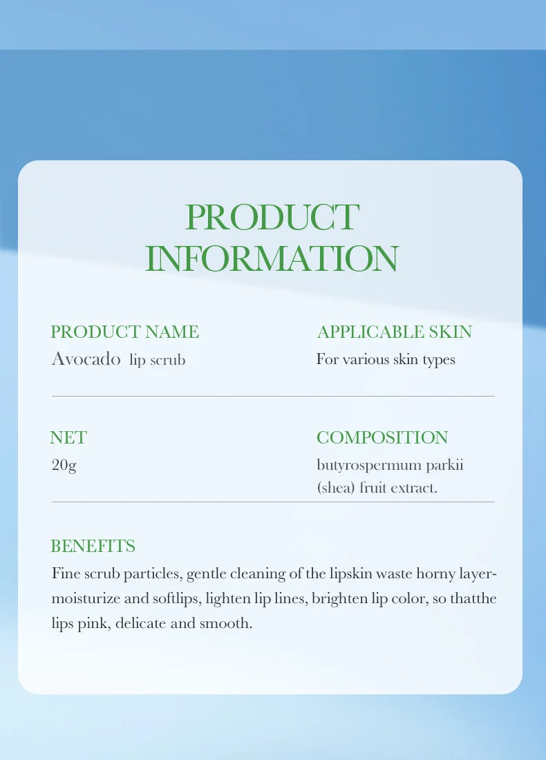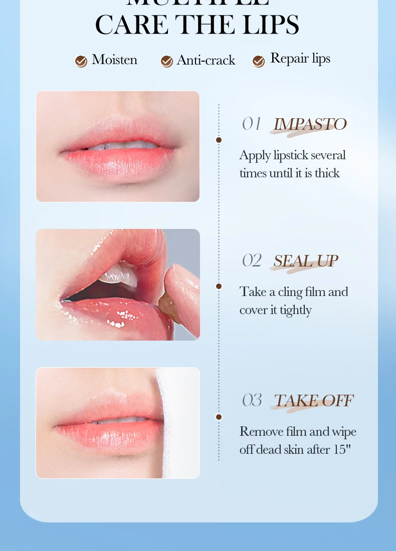 Fine scrub particles, gentle cleaning of the lipskin waste horny layer,moisturize and softlips, lighten lip lines,brighten lip color, so thatthe lips pink, delicate and smooth.