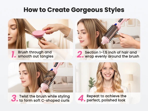 30-Second Heat, 3-in-1 StylingThe heated thermal round brush with dual PTC heating warms up in 30 seconds. It works as a straightener, curling iron, and volumizing brush all in one. Easily smooth, curl, add volume, or detangle. Just wrap your hair around the barrel and slide down—get sleek, bouncy curls in minutes. No extra tools such as combs or clips needed. Save time and effort. Handles all your styling needs for any occasion